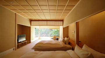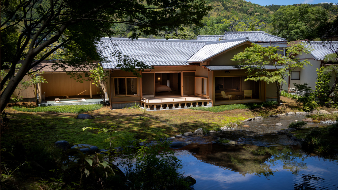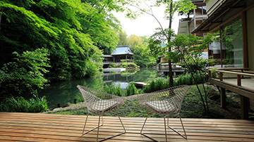 池と能舞台に面した3間の広々とした客室。池や滝を眺めながら入浴ができる。