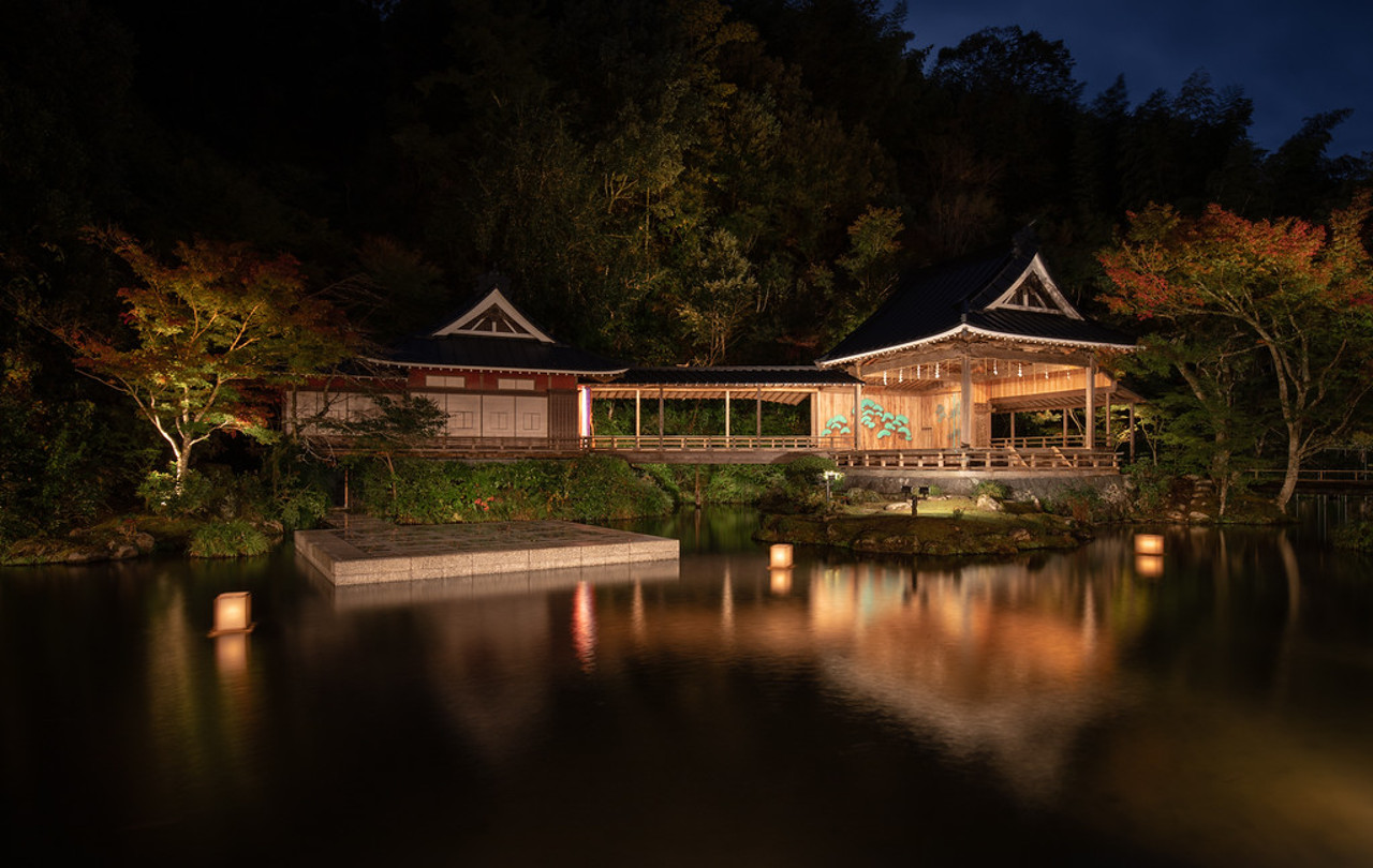 旧大聖寺藩主、前田利鬯子爵より寄進された能舞台「月桂殿」。 明治後期、七代目浅羽保右衛門があさばへと移築され、現代へと受け継がれています。 約40年前より「修善寺藝術紀行」と題し、日本の伝統芸能である能楽、狂言、新内、 文楽、琵琶楽を、当世一流の師を招き、季節に応じて公演しております。 闇夜に奏でる幽玄な世界を堪能できる、一期一会のひとときをぜひお過ごし下さい。